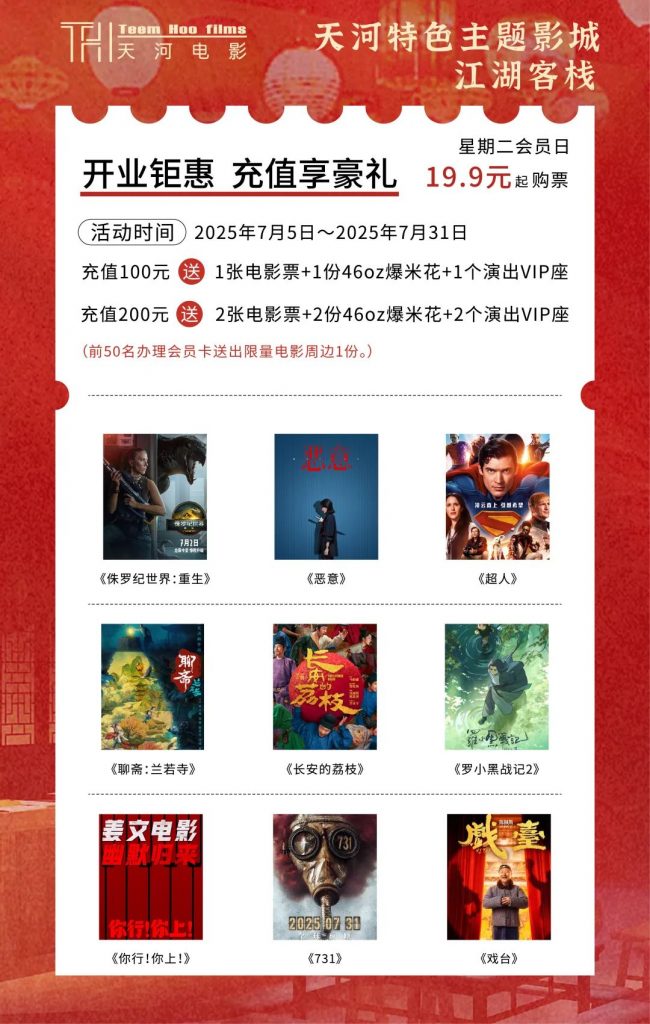 踏入影城,就像闖進(jìn)武俠小說(shuō)里的場(chǎng)景:客棧、酒館、茶鋪、戲臺全實(shí)景復刻,勾欄瓦肆間藏著(zhù)小橋流水,花卉樹(shù)木旁透著(zhù)古色古香。5 大主題影廳——“沙洋軒”“云夢(mèng)澤”“荊江閣”“鶴鳴洲”“漢津渡”,光聽(tīng)名字就俠氣沖天!再配上全激光、3D 等硬核技術(shù),看武俠片時(shí),仿佛自己就在刀光劍影里穿梭!